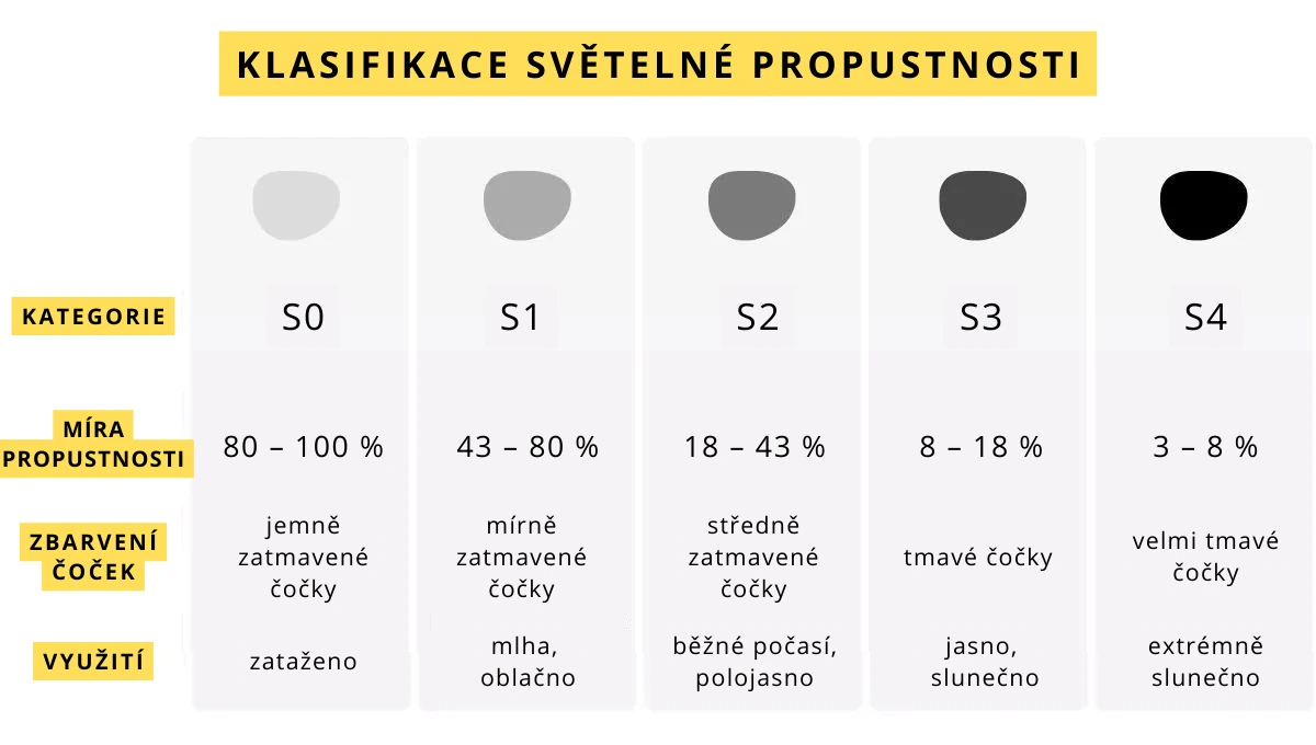 Kategorie propustnosti barevných skel je S2, u černých polarizačních skel S3.
