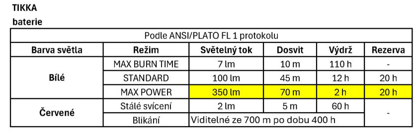 - Tři intenzity svícení: max. doba svícení, standardní (vyvážený poměr výdrže a výkonu) a max. výkon.