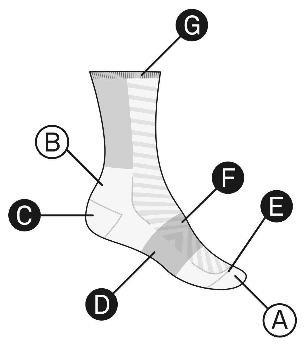 C – Zesílená pata a špička pro odolnost a pevnost.