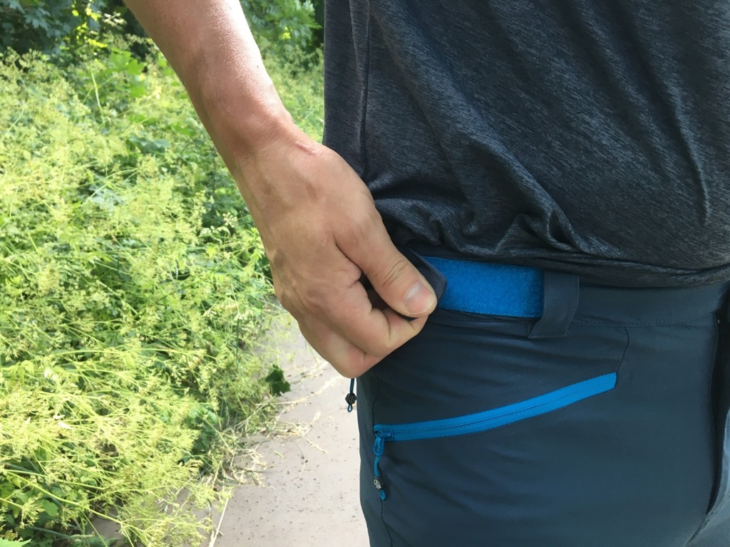 Integrovaný pásek s použitím stahovacích patek na suchý zip je příjemným detailem, díky kterému dokážete pohodlně upravit pas přesně podle potřeby a současně vám pružení zanechává volnost pohybu. Kalhoty drží na svém místě i při důraznějším pohybu a prodírání se po skalních masivech.