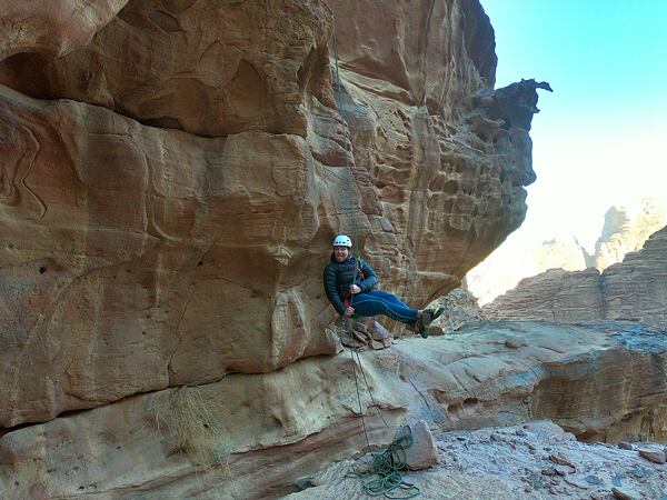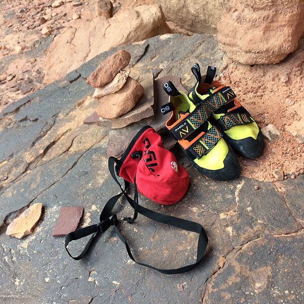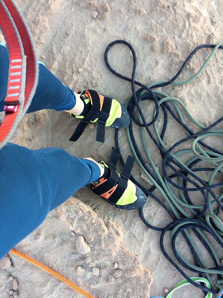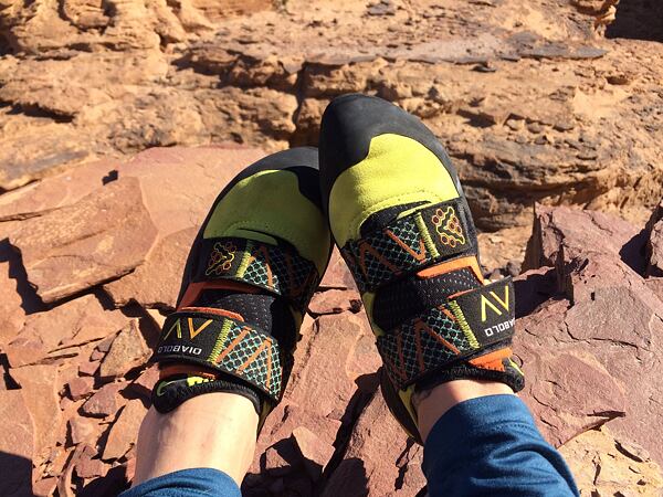 Prvních pár cest na překližce bylo rozpačitých, lezečky mají jiný tvar, než na který jsem zvyklá a jsou mnohem tvrdší. Při těžších cestách jsem jim zprvu moc nevěřila, ale po nějaké době jsem si začala dovolovat více a botám více věřit a vyplatilo se. Na umělé stěně drží noha jako přibitá. Nastal čas, otestovat je venku. I na jordánském písku lezečky splnily svojí funkci a prošly testem bez ztráty kytičky. Wadi Rum je mimo jiné plný úplně hladkých rajbasů, kde je potřeba se na lezečky stoprocentně spolehnout, protože je to jediné, co vás na skále může udržet. Přesně takové Diabola jsou.