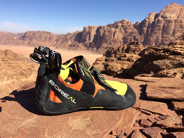 Diabolo mají mezipodešev speciálně vyztuženou tak, aby nedocházelo k její deformaci. Podešev je ze speciální lepičky Zenith Pro, která se vyznačuje skvělou přilnavostí, vysokou kvalitou a dlouhodobou trvanlivostí. Tuto lepičku si vyvinuli přímo v Borealu. Ani po zátěžové zkoušce ve Wadi Rum nemůžu říct, že by na botách byly viditelné známky opotřebení. Lepička má tloušťku 4-4,5 mm v závislosti na velikosti boty. Bota má jednoduché zapínání na dva suché zipy, které skvěle drží, neodlepují se a výrazně zpevňují nárt. Noha je v lezečce dobře upevněná a bota zároveň poskytuje pohodlí, které je potřebné například při vícedélkovém lezení.