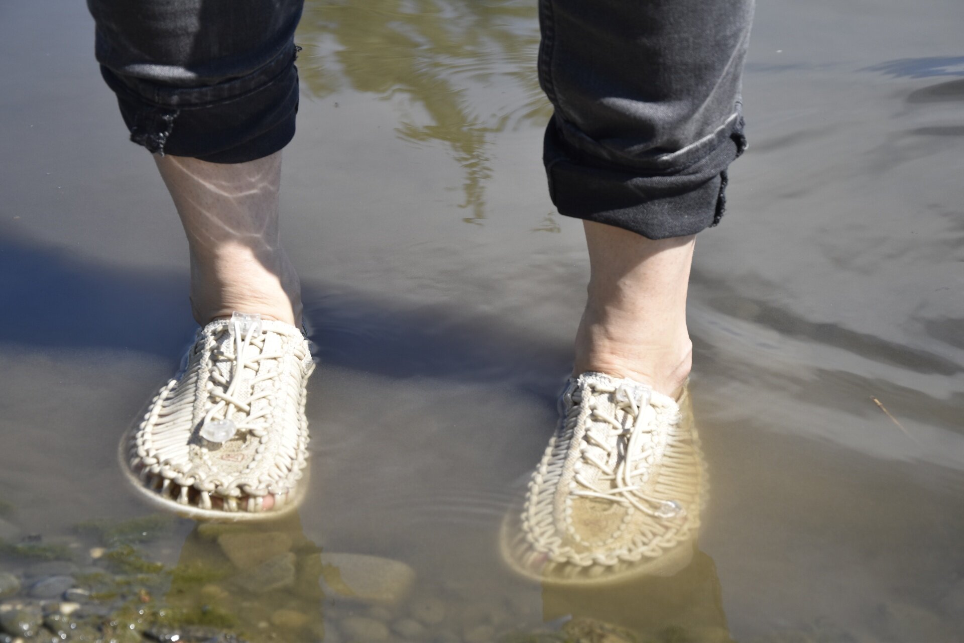 Stahování na šňůrky je zakončeno plastovou brzdičkou, vše vyrobené z recyklovaných PET lahvíPro mě je model Uneek Canvas vysoce multifunkční. Chodím v něm do práce i v práci, do divadla, do galerií, venčit psa, řídí se v nich dobře. Ani vody není třeba se obávat, dají se použít místo bot do vody. Taky na svatbě se mnou byly. Mají opravdu široký záběr. Vyrobily se ve světlejších odstínech a na našich prodejnách najdete dvě barevné variace.