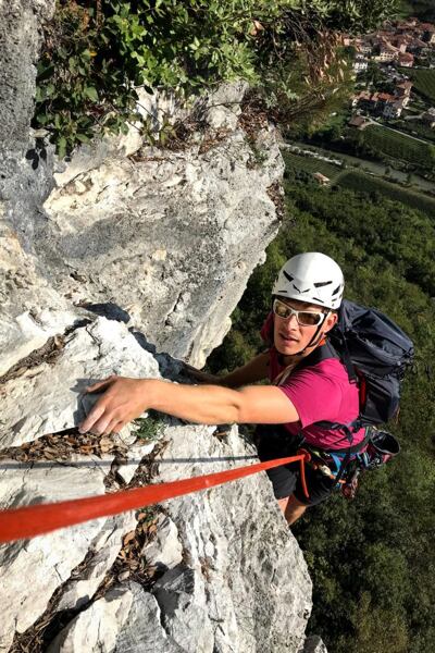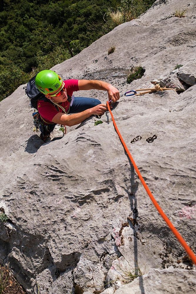 Mé osobní doporučení k samotnému lezení: ve východní stěně se v Arcu během léta upečete, ideálně cestu lezte na jaře nebo na podzim (nebo brzy z rána), a do 4. “klíčové délky” se pak může hodit dvojkový camalot.