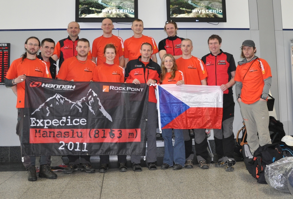 Účastníci Expedice Manaslu 8163 m z roku 2011 a naši trekaři na letišti. Později jsme se již v expedičních tričkách takhle pohromadě již nesešli. Velká parta byla zábavná. Vůbec jsme se nedostali k ponorkové nemoci.