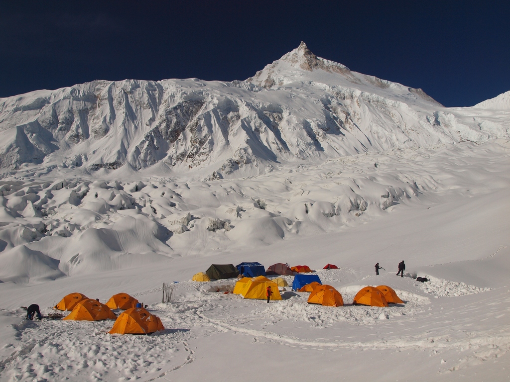 Vykolíkovaná místa na stany komerčních expedic. Již tehdy jsme byli jedni z mála na kopci bez umělého kyslíku a nosičů.