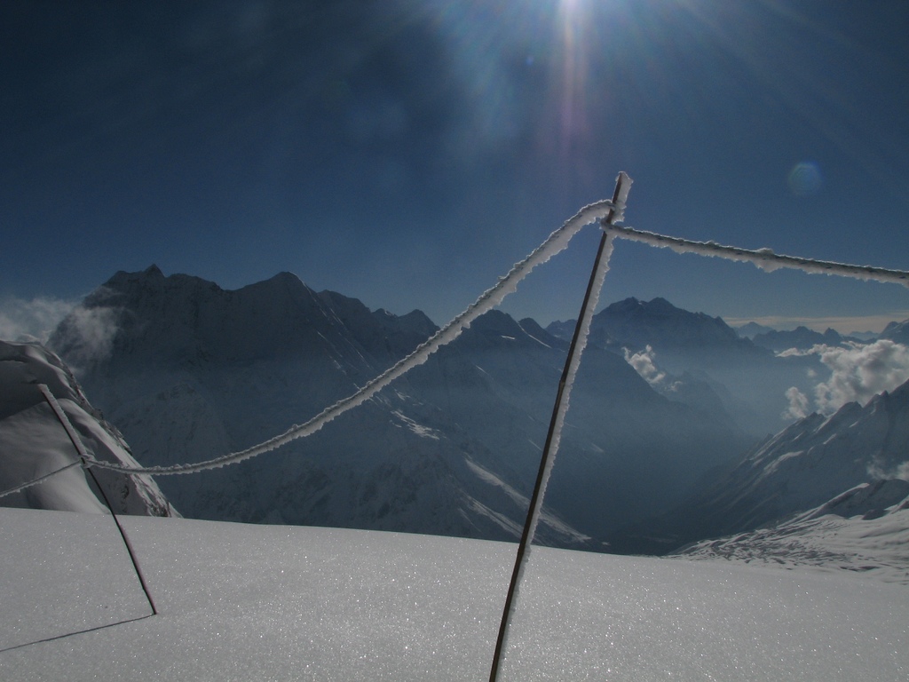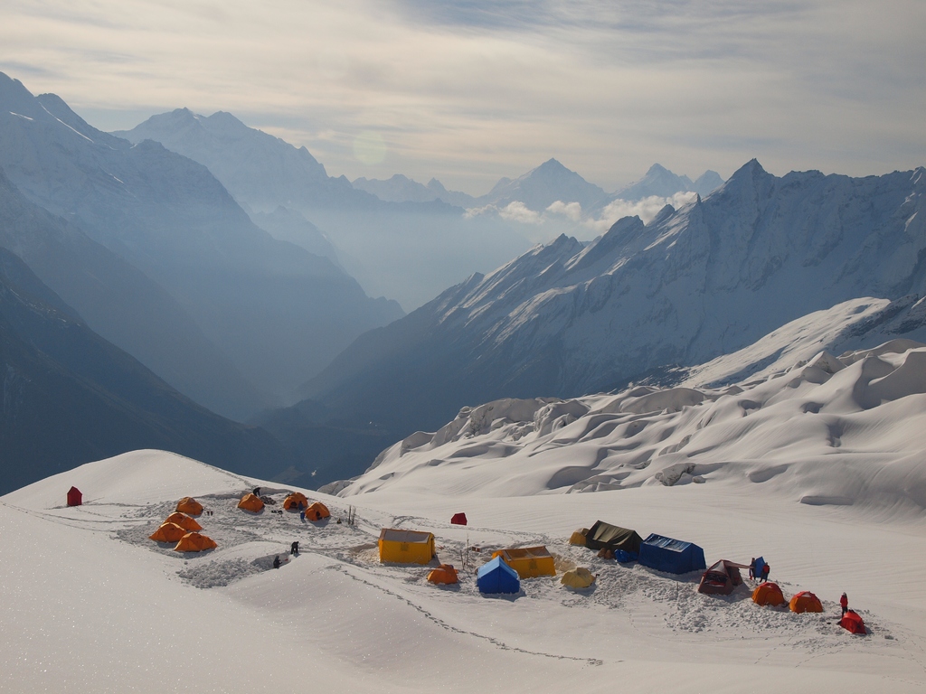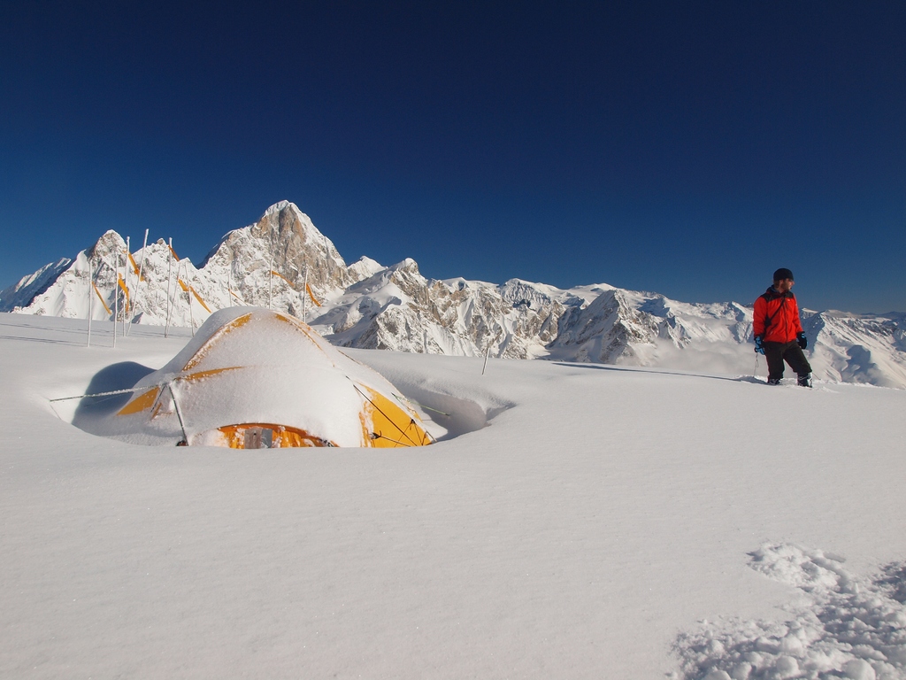 Základní tábor je ve výšce Mont Blancu, asi 4800 m. V roce 2011 byla spousta sněhu.