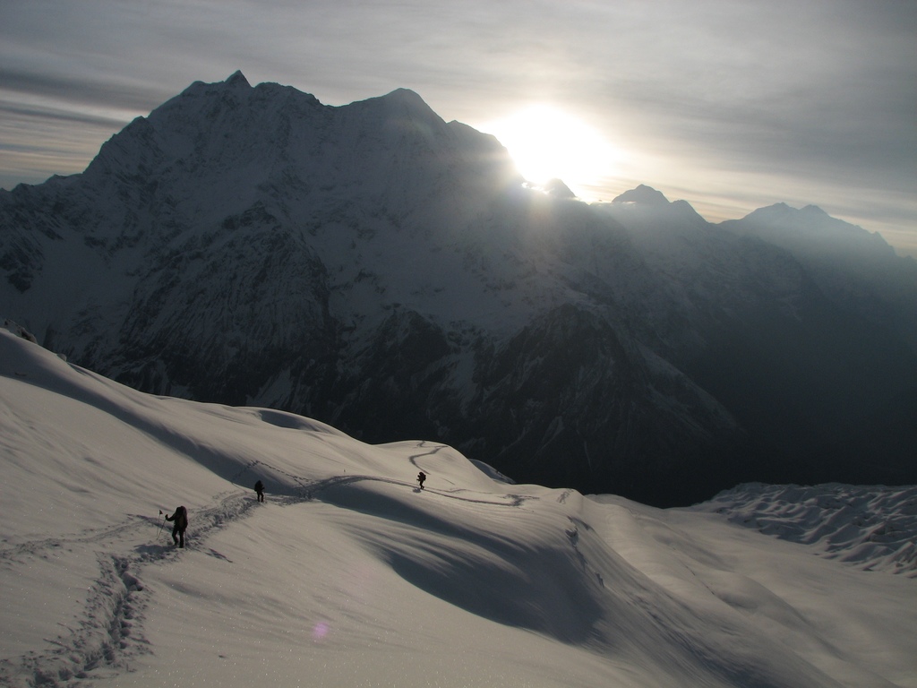 Východ slunce nad Manáslu. Barvičky mne v horách baví. Kluci šlapou na lyžích směrem k dalšímu dobrodružství.
