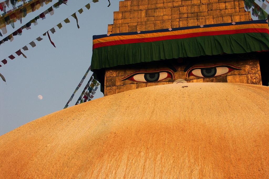 Budhovo vědoucí oči – konečně zase „doma“. Směsice budhistických chrámů a hinduistických svatyní vytváří jedno z nejzajímavějších měst na světě. Nepál, Káthmandu, na fotce Boudhanát