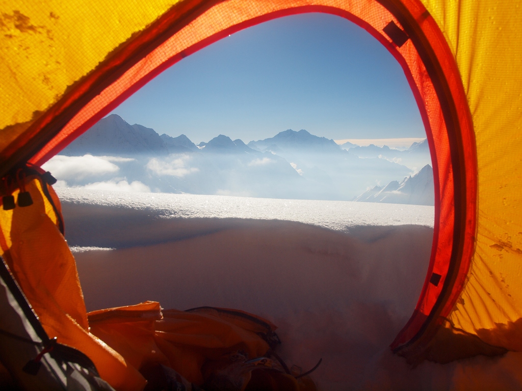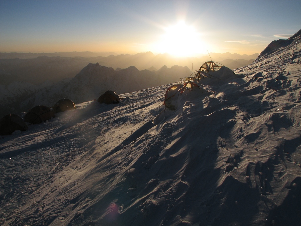A jsem o kus výš. Brzo ráno někde ve výšce 7400 m. Zbytky stanů v posledním výškovým táboře. Pěkná kosa byla.