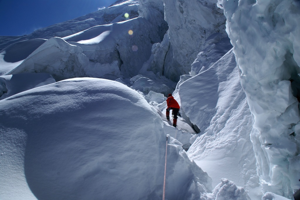 Průstup ledopády pod hrozivými séraky není nikde moc příjemný. A zde jdeme ještě, co noha nohu mine. Jsme vysoko. Dýchání je už dost na prd.