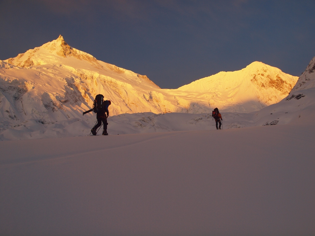 Východ slunce nad Manáslu. Barvičky mne v horách baví. Kluci šlapou na lyžích směrem k dalšímu dobrodružství.