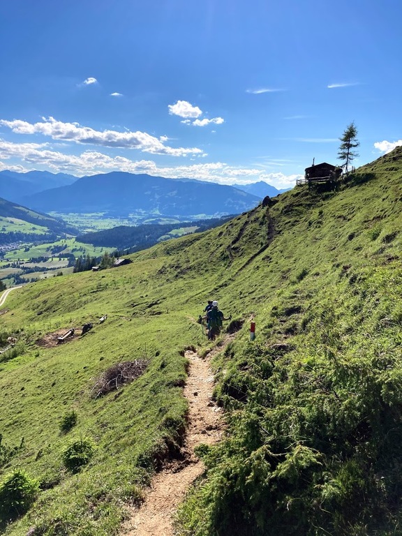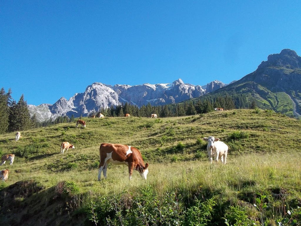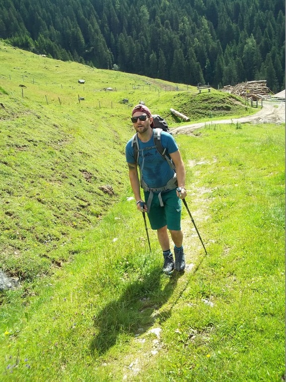 Z výchozího bodu našeho výletu, sedla Dientner Sattel, jsme vyrazili okolo půl osmé. K samotné ferratě vede cca 2hodinový nástup do kopce přes pastviny, chatu Erichhütte a následně horskou pěšinku zakončenou kratšími žebříky.