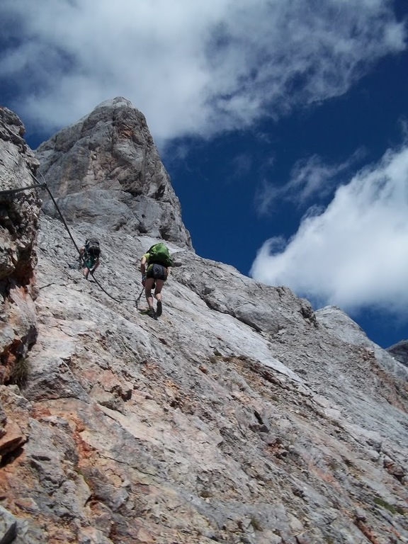 Naší partičce (bohužel bez Karla) zabralo lezení přes 5 hodin s tím, že jsme se zasekli v jedné ze závěrečných pasáži asi na 20 minut kvůli opravě ferraty místními správci. Po zdolání cesty se můžete vydat rovnou na poměrně nejistý a nebezpečný sestup po červené, který je velmi prudký a navíc se sněhovými/suťovými pasážemi, kde rozhodně není dobré padat a hrozí úraz od možného padajícího kamení. Na tuto trasu lze slézt v případě potřeby také v cca 2/3 ferraty.