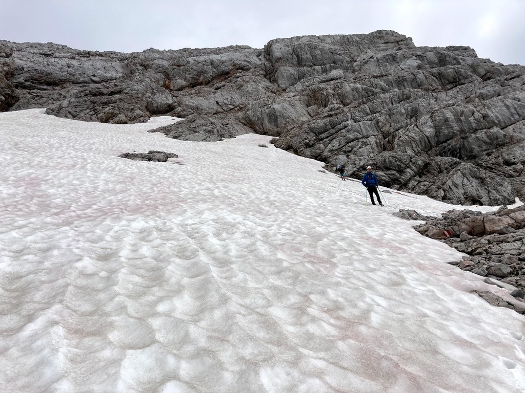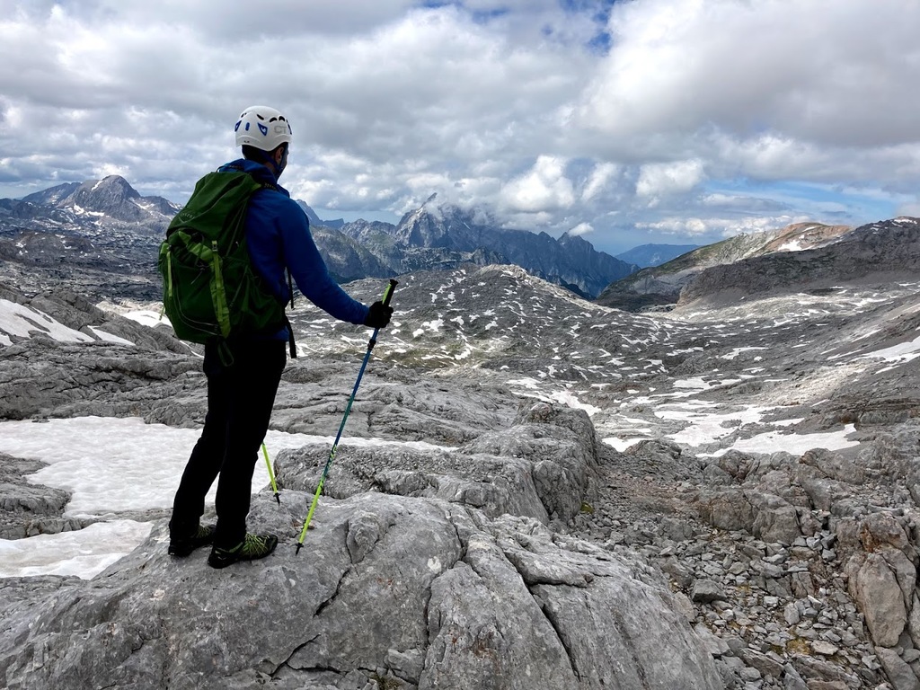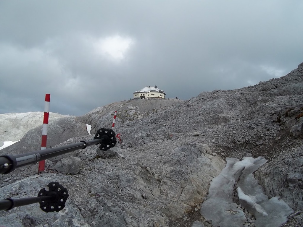 Od Torsaule se začínají objevovat sněhová pole, ale není to nic dramatického, co by se nedalo zvládnout v nízkých trekových botách. Pak už jen stoupáte kamením a sněhem směr cíl, což je chata na vrcholu Hochkönigu - Matrashaus. Kousek pod chatou vám ještě trochu stíží cestu k vytouženému cíli dva žebříky, ale není se čeho bát.
