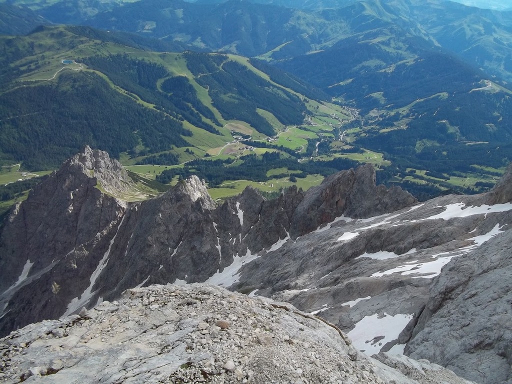 Po náročné cestě do kopce nás čekal nástup ferraty vedoucí na Selbhorn. Celá ferrata byla oproti předešlému dni pěkně suchá a lezení bylo radost. Všechny úseky byly jištěné, a to i „chodecký“ terén. Zajištěnou cestou jsme se dostali na vrchol poměrně rychle (asi za 1,5h), následovala svačina a sestup dolů, který byl opravdu nepříjemný a zdlouhavý.