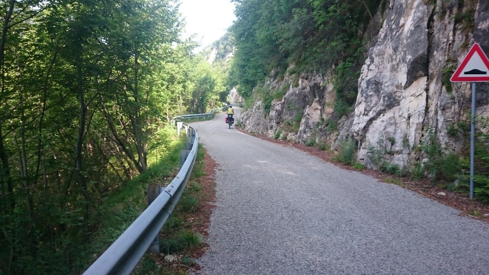 Teprve za městečkem Valmareno začínáme pomalu stoupat k horám. Po pár hodinách nám cesta do kopce připadá nekonečná a zatáčky už ani nepočítám. Občas nás předjedou cyklisté na silničkách nebo důchodci na elektrokolech.