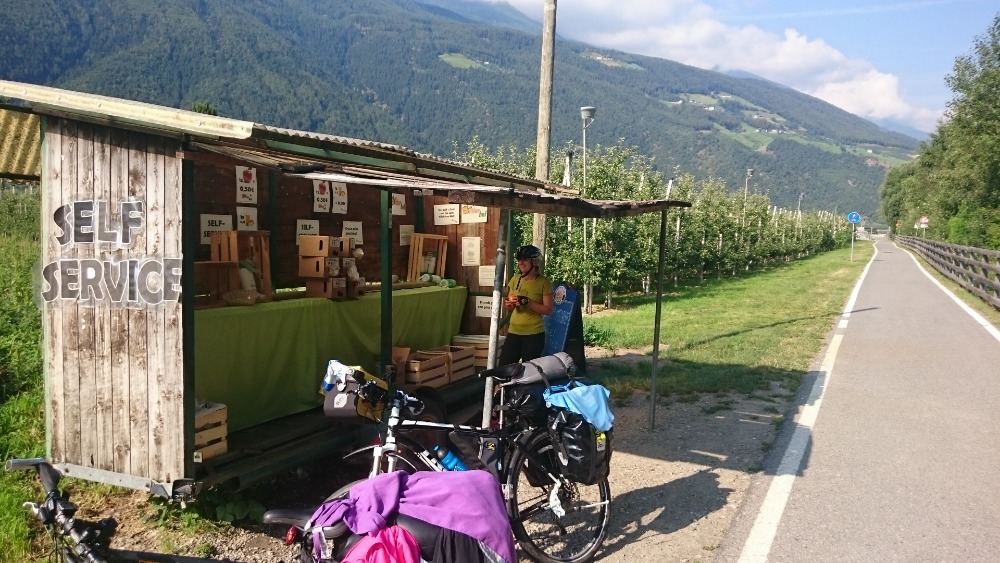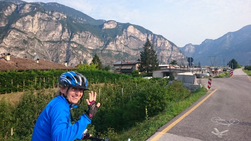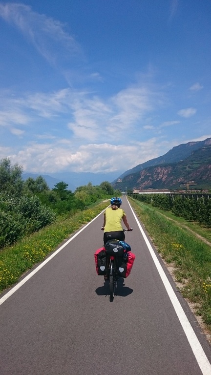 Po asfaltu kilometry rychle přibývají. Po obou stranách cyklo stezky jsou Alpy a jabloňové sady.