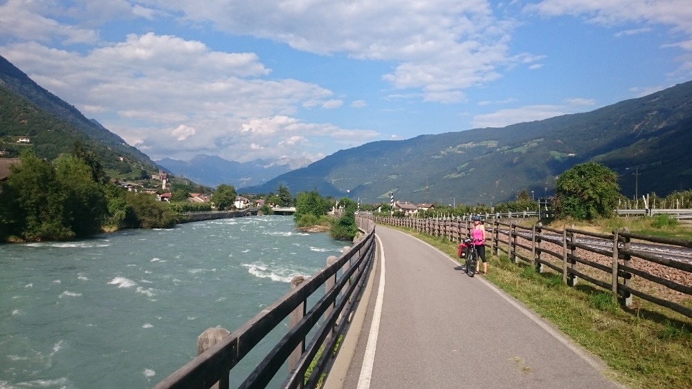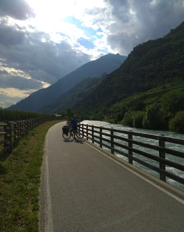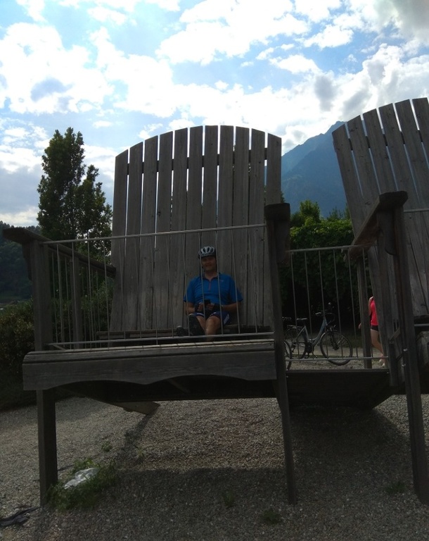 Po krásném úseku na rovině proti proudu řeky a po pěkném asfaltu kilometry rychle přibývají. Na obou stranách koryta řeky Adige jsou Alpy a jabloňové sady. Krásné na pohled, ale ta monotónní jízda je celkem nuda. Z Merana nás však čeká opět stoupání. Už se celkem těším, to šlapání po rovině není úplně pro mne. Úžasná je vyhlídka se dvěma křesly a výhledem do údolí.