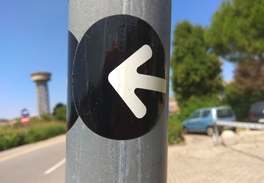 Před odjezdem jsme si koupili podrobnou knížečku o této cestě a raději si stáhli ještě trasu do navigace v telefonu, což se ukázalo jako dobrý nápad, protože z města se vymotáváme jen díky navigaci. Cyklostezku sice označuje malá bílá šipka, která se občas objeví na sloupu v černém kolečku, ale ve městě jí nemáme šanci na druhé straně křižovatky vidět.