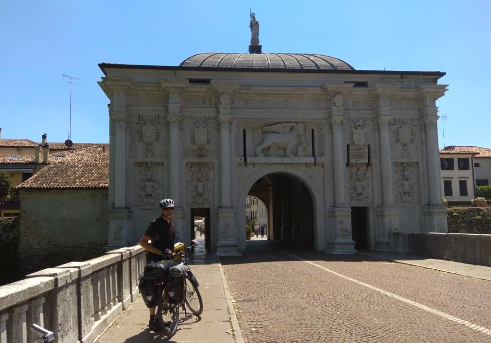 Cesta nás vede pryč z města mezi lány s kukuřicí a potom vesničkami podél vody, kde je stín a chládek. Občas nás vrátí do nějakého historického města, jako je třeba Quarto D'Altino. Zatím je povrch převážně asfaltový a celkem rovinatý. Blížíme se k městu Treviso a v dálce už na nás konečně vykukují Alpy.