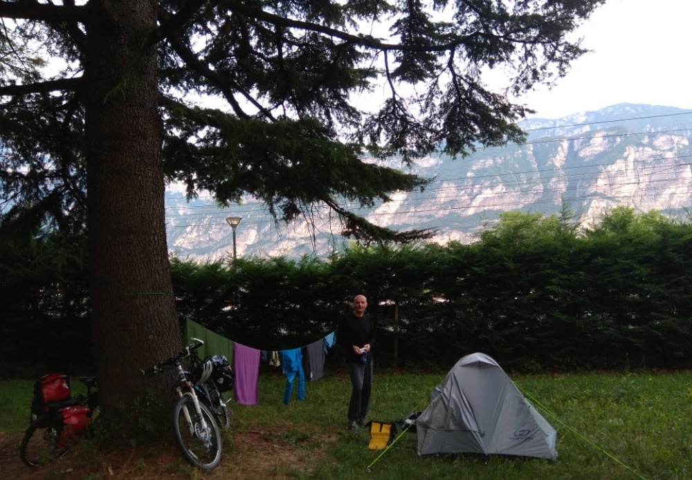 V kempu u městečka San Michaele All Adige jsme jen my a jedna rodina. Pravda, to nádraží hned za živým plotem dělalo trochu rachot...