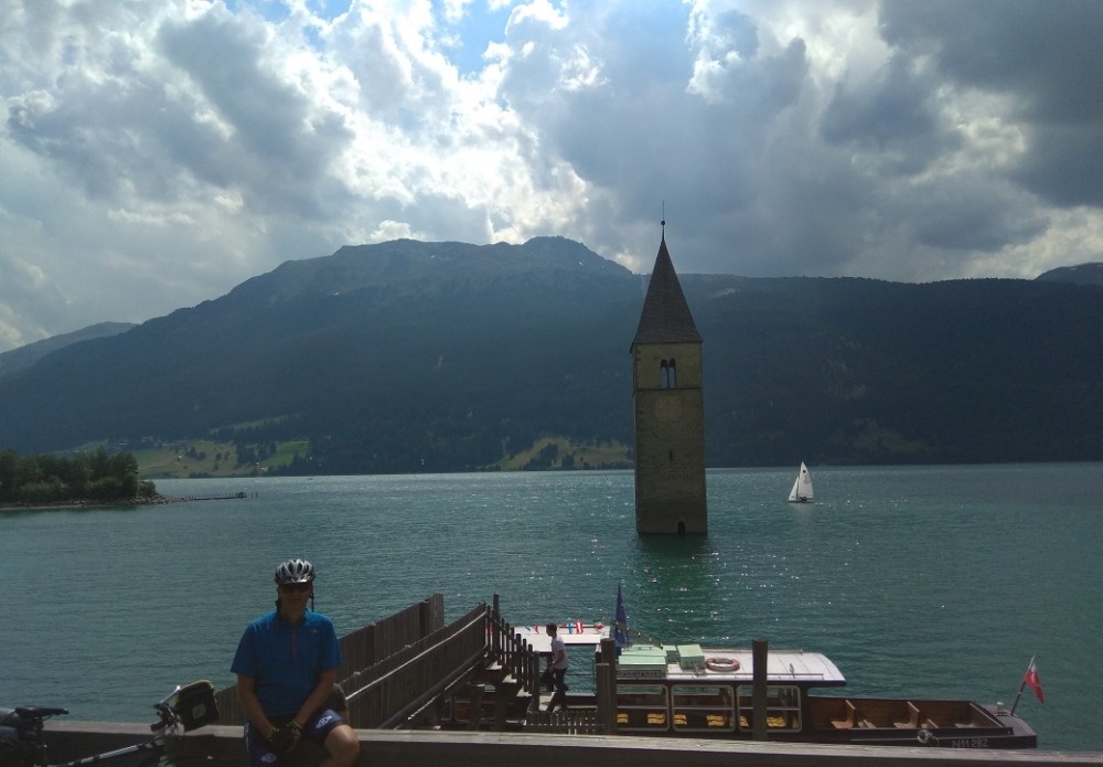 Z jezera Reschensee vyčnívá kostelní věž obce Alt Graun zaplavené v roce 1953 při výstavbě přehrady.