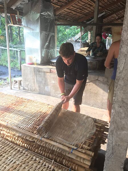 Dali jsme si zde k snídani polévku a po dalších pár kilometrech plavby jsme si měli možnost vyrobit vlastní rýžové nudle. Poslední zastávkou plavby byla výrobna kokosových bonbónů a místní trh.