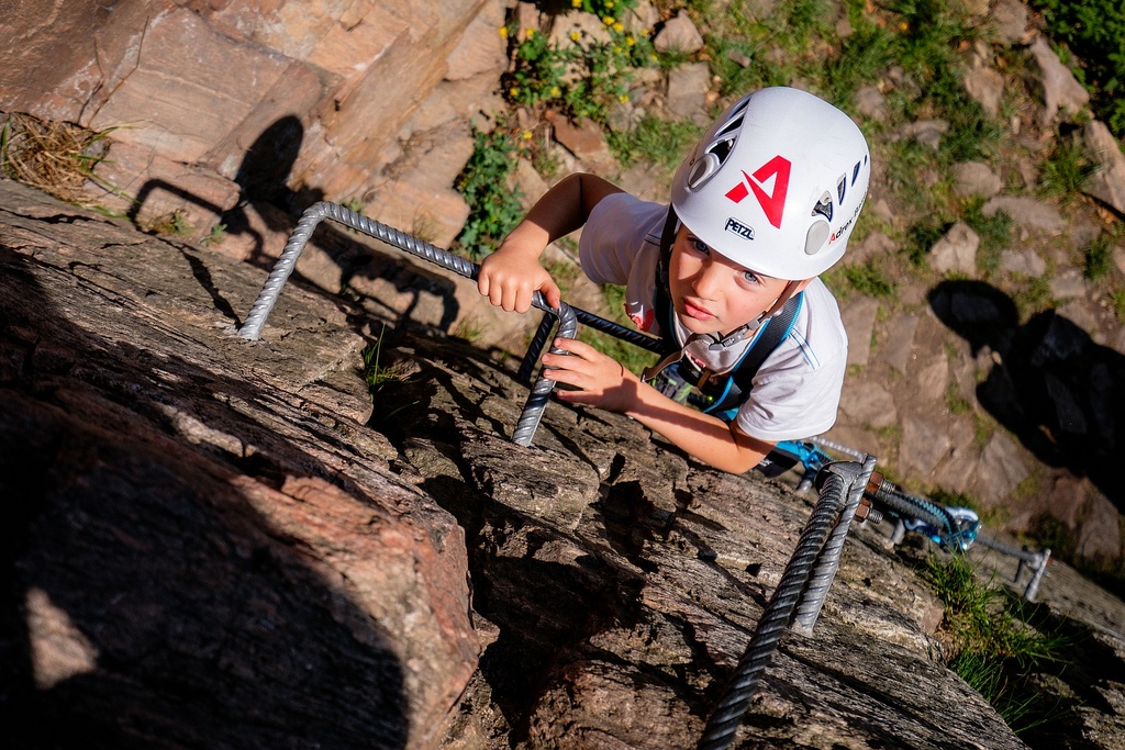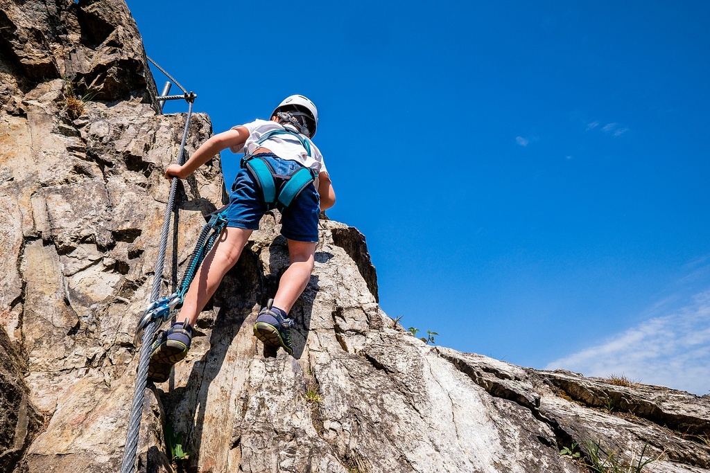 Děti vybavte kombinovaným nebo celotělovým úvazkem, helmou a dětským ferratovým tlumičem pádů