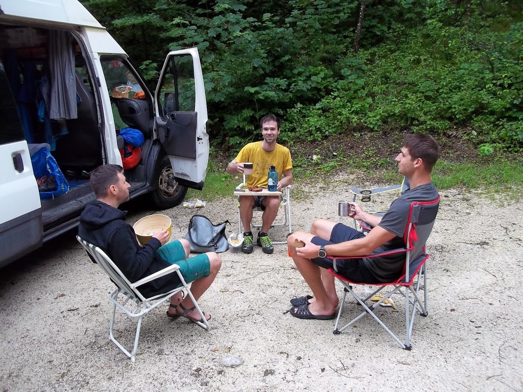 První den naší ferratové akce nám začal silným deštěm, který ustával až okolo poledne. Všichni máme zkušenosti se skalním lezením a rozhodli jsme se tedy, že i přes nepříznivé podmínky do ferraty nastoupíme.