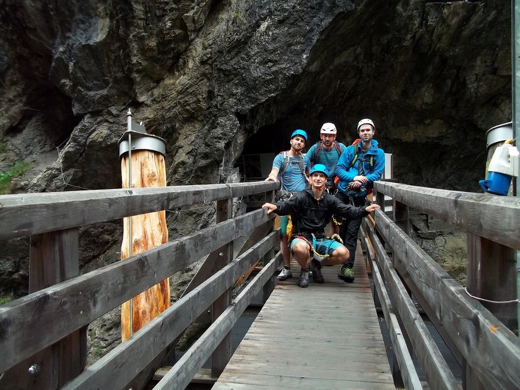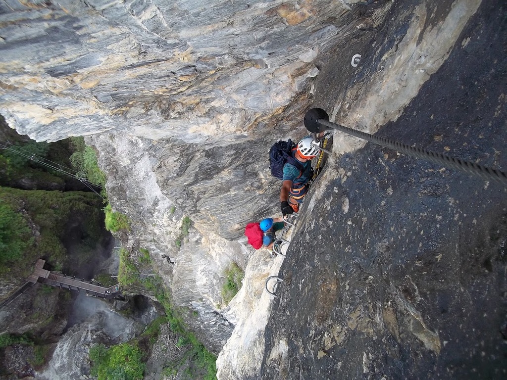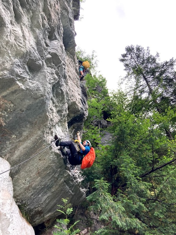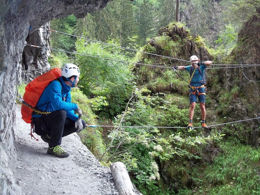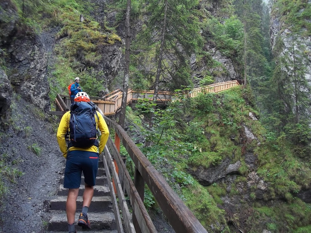 V soutěsce nás jako první ohromil cca. 60 metrů vysoký vodopád, na který byl po dešti fascinující pohled. Místní cesta Kitzklettersteig do které jsme se nakonec pustili je hodnocená obtížností D. Ferrata je poměrně vzdušná, s četnými převisy, lanovým mostem a dalšími zajímavými pasážemi.