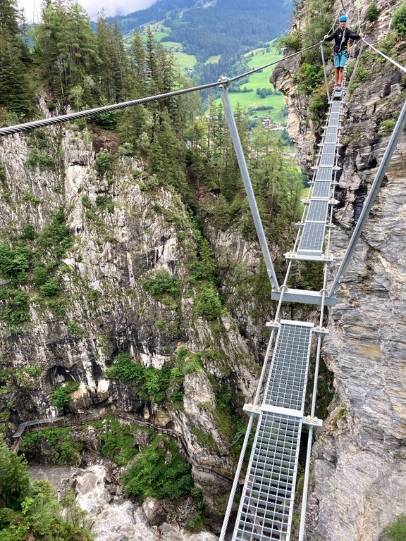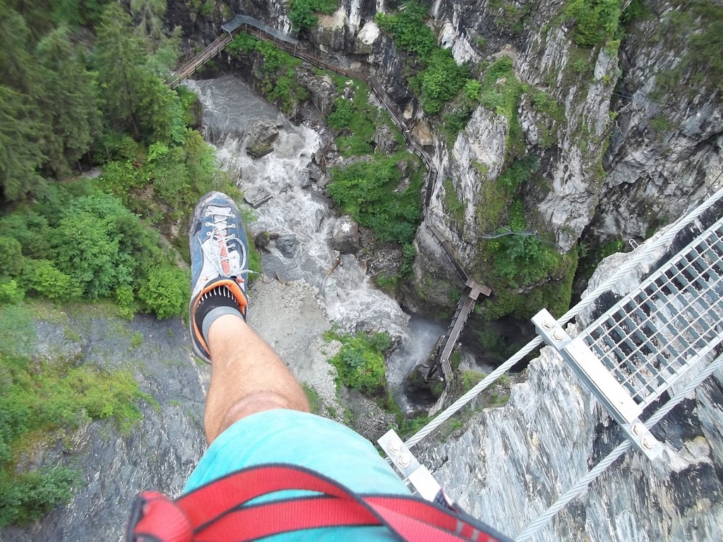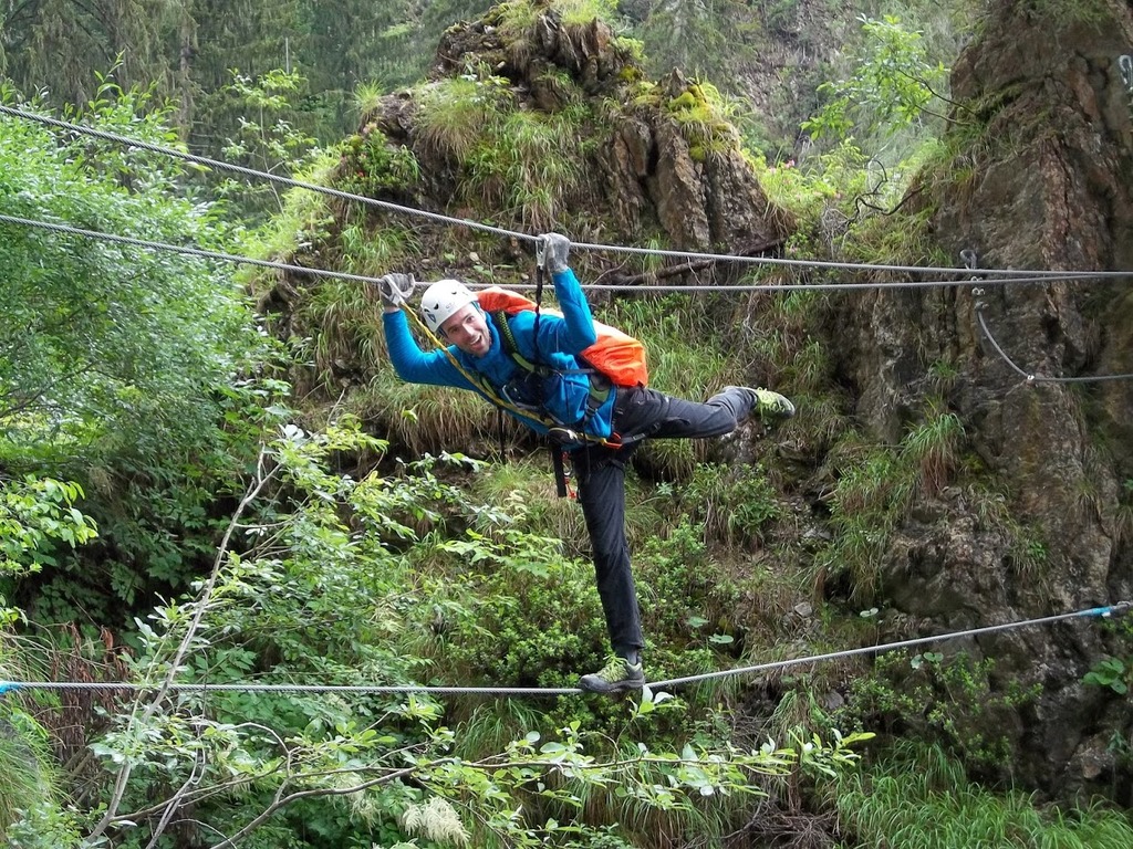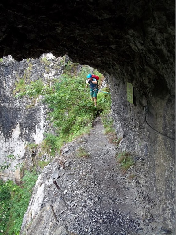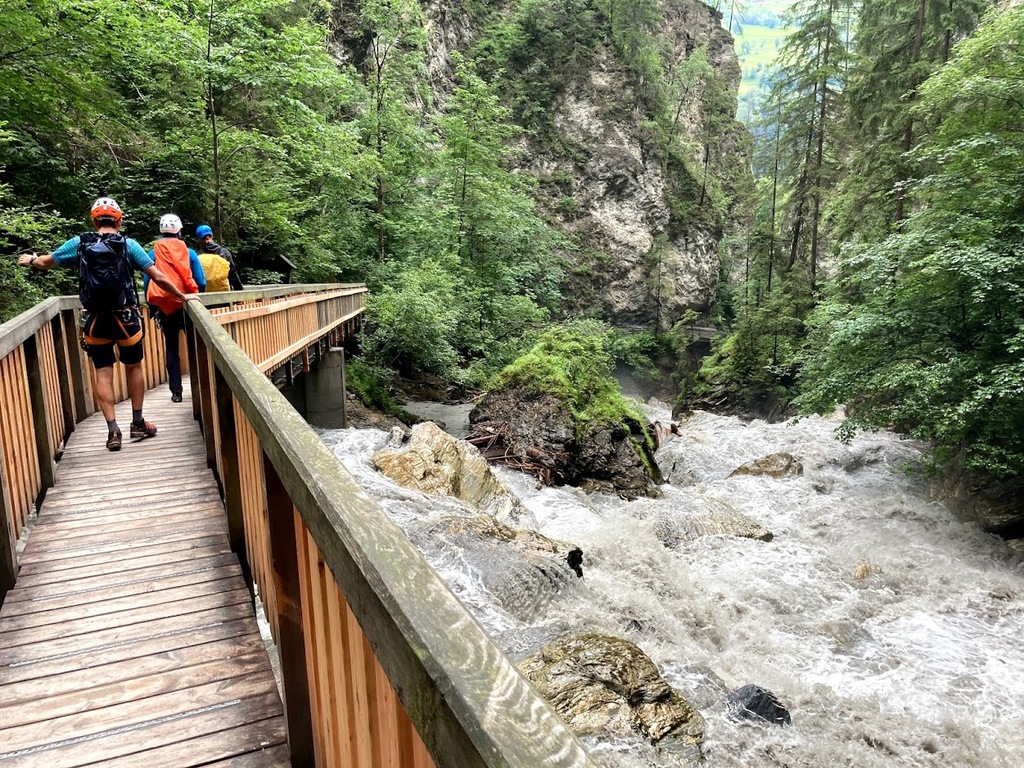 V soutěsce nás jako první ohromil cca. 60 metrů vysoký vodopád, na který byl po dešti fascinující pohled. Místní cesta Kitzklettersteig do které jsme se nakonec pustili je hodnocená obtížností D. Ferrata je poměrně vzdušná, s četnými převisy, lanovým mostem a dalšími zajímavými pasážemi.