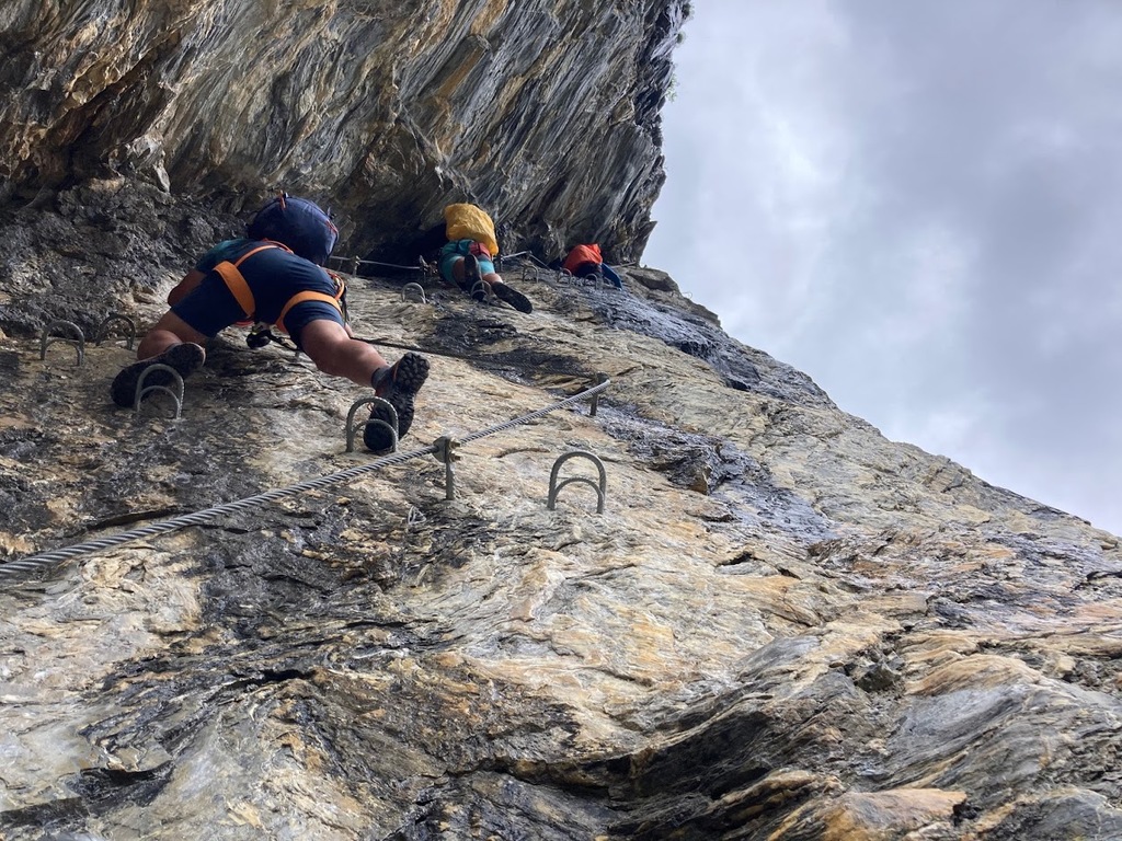 V našem případě byla ferrata kvůli dešti hodně mokrá, nohy na kluzké skále nedržely a museli jsme se spoléhat pouze na ruce. Jediným benefitem bylo to, že jsme byli na ferratě úplně sami, nemuseli jsme nikam spěchat a dosyta jsme si vychutnávali rozhledy a lezení těžkých úseků, kdy ani o převisy nebyla nouze.