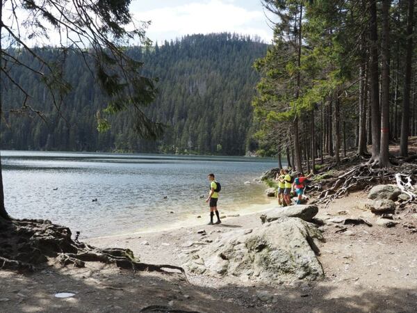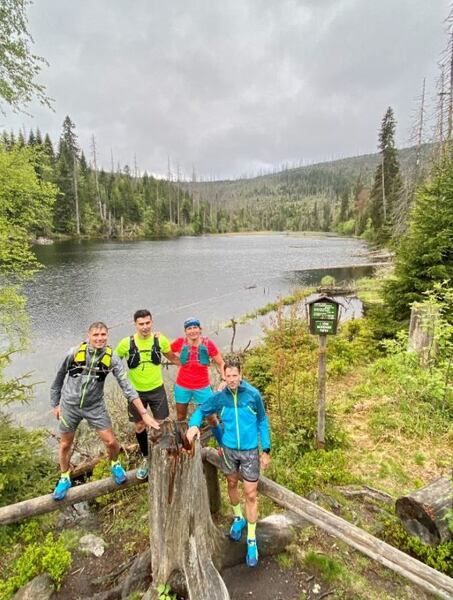 Mužajs má sil na rozdávání a zásobuje nás dalšími vtípky. Úsměvy vydrží však jen chvilku, jelikož máme před sebou brutální stěnu k Rozvodí, odkud padáme k Čertovu jezeru. „Bože, je tu krásně!“, říkám si. Slunce svítí, kachny na hladině a čtyři pološílení běžci. Jojo, ŠUMAVA čaruje.