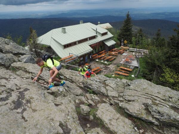 Hned výběh na Ostrý je velká paráda.Na vrcholu jsem byl už několikrát, vyběhl snad ze všech stran, ale nikdy mě to neomrzí. Odměnou je vždy krásný výhled. Ani tentokrát tomu není jinak. Samozřejmě nechybí vrcholová fota. Škoda, že se zatahuje a mrholí. Navíc, hospoda je zavřená. Taková Knoblauchsuppe by bodla. V rychlosti jíme něco z vlastních zásob a rubeme dál, abychom moc nevychladli.