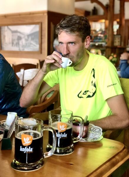 Pecka! Mají otevřeno. Kafíčko, kofola, tvarohový dezert. Ostatní jsou na tom podobně. Palačinky s Nutelou jsou prý taky prudce jedlý… Potkáváme se tu i s kamarádem z Tachova Zbynďou „Maty“ Matasem, který je tu na Šumavě skoro jako doma. Dneska, že prý dal něco přes Ostrý a tak. Skromně popisuje 30kilometrovou běžeckou nálož. Nejsme v tom sami.