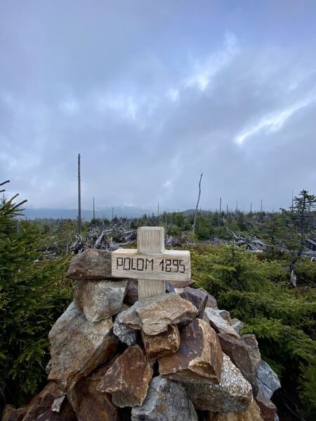 Já si opět vrchovatě užívám každý krok, protože toto mě prostě baví. Na vrcholku na nás čeká větší kopa kamení s malou dřevěnou cedulkou, Polom 1295 m n. m. Hm, dobrý! To bychom měli!