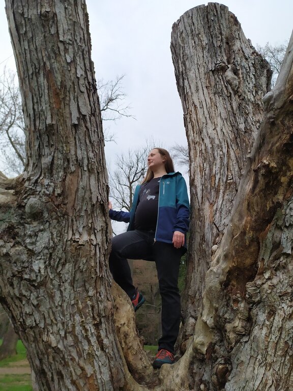 Dnes déšť, zima. Ale jak se říká, není špatného počasí, jen vybavení. Takže Gore-tex botky, nepromokavá bunda, samozřejmě testovací tričko a vyrážím do přírody. Lézt po skalách sice nemůžu, ale na strom jsem si vylezla s chutí.