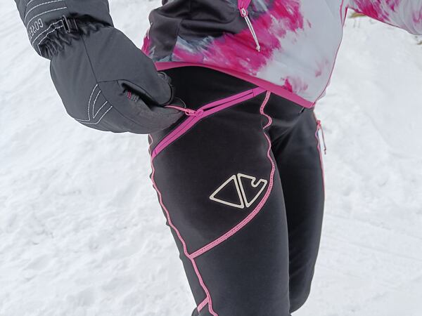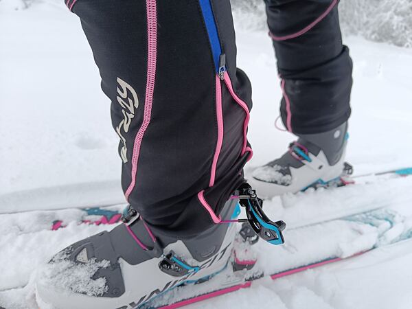 V klínu je ve spodní třetině průchod, pro ovládání přezky skialpových bot. Nohavice jsou zakončené légou, která je částečně pružná.