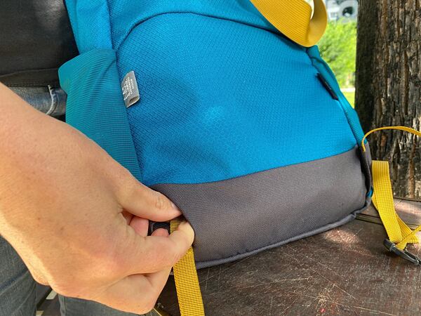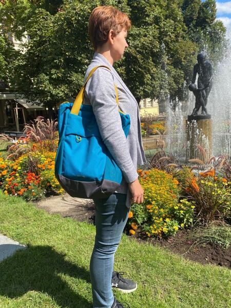 Uvítala jsem, že dno tašky je z tmavého materiálu, a tak na něm není vidět špína po prvním položení na zem. Batoh je vyrobený z recyklovaných materiálů s certifikátem blueSign®, recyklovaného nylonu a se zátěrem DWR (bez PFC).