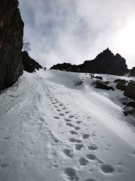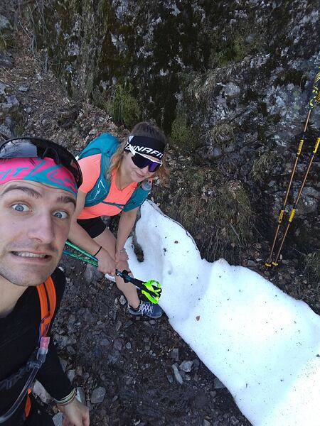 Hned na začátku etapy nás čeká největší výzva. Dostat se do nejvyššího bodu na celé trase. Po asi dvou a půl hodinách škrábání se z větší části po zledovatělém sněhu jsme uznali, že tudy cesta nevede. Na takto brzký přechod sedla ve 2600 metrech nejsme ani zdaleka vybavení. Voláme tedy holkám, aby nás dole vyzvedly a celý hřeben objíždíme.