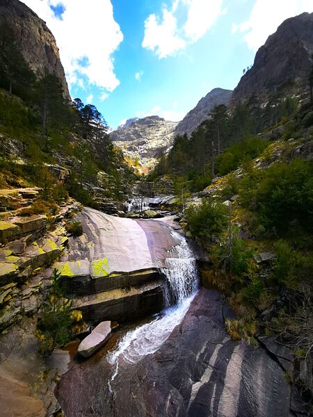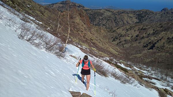Potkáváme prázdná refugia, za každým hřebenem se nám krajina mění před očima, a konečně, asi v 1600 metrech, potkáváme první sníh. Korsika je v tomhle ohledu opravdu jedinečná. Díky pestrosti místní krajiny můžete za jeden den poznat rozeklané hřebeny i zelená údolí.