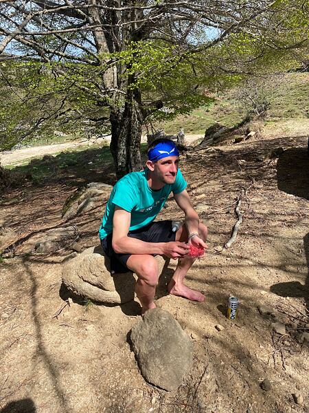 Kolem páté hodiny odpoledne se konečně dostáváme na hřeben, ze kterého už je vidět do údolí, kde na nás čekají holky s jídlem, spacáky a otevřenou náručí. Po doběhu okamžitě doplňujeme všechno potřebné, tedy ionťáky, jídlo, vodu...