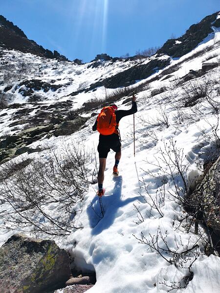 Počítejte s tím, že v podstatě všude nad cca 1700 m n. m. je sníh (v našem případě na konci dubna). To znamená dobré boty, trekingové hole, nesmeky. Potkal jsem i dva turisty, co měli regulérní mačky a cepíny, které by se nám např. při přechodu sedla u Monte Cinta docela hodily).