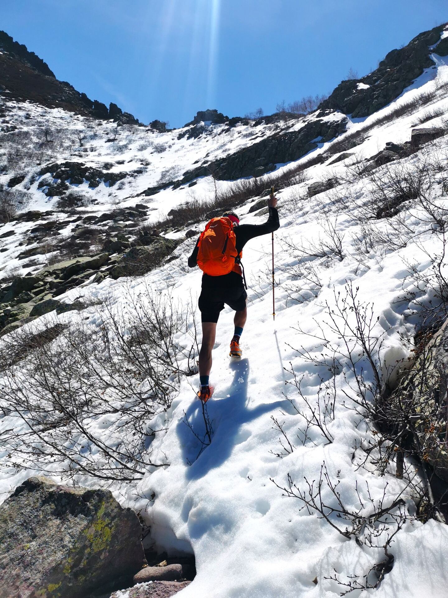 Bohužel, ten více techničtější a současně i výše položený úsek, mě ještě čeká. Na hřebenech už mě sníh nepřekvapuje, jen jsem nepočítal se silným protivětrem, který mi kromě morálu, bere i síly. Ale už jen dvakrát nahoru a dolů, přeběhnout 7km skalnatý hřebínek a pak už to je “jenom” z kopce.