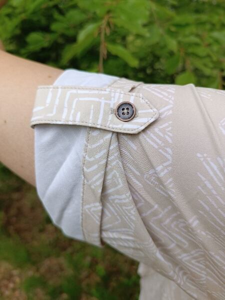 Délka rukávů je nastavitelná, v případě potřeby se dají ohrnout a zajistit knoflíčkem, což jsem využívala při vyšších teplotách. V zadní části halenky je skrytá kapsa na zip, do které se mi pohodlně vešlo balení kapesníků i menší telefon.