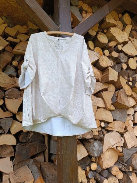 Zajímavým detailem jsou záhyby, které zakrývají oblast břicha, takže pokud máte nějaké to kilo navíc, tak ho v této halence lehce schováte. Střih halenky je volnější, takže pokud jste na rozmezí mezi dvěma velikostmi, sáhněte raději po té menší.