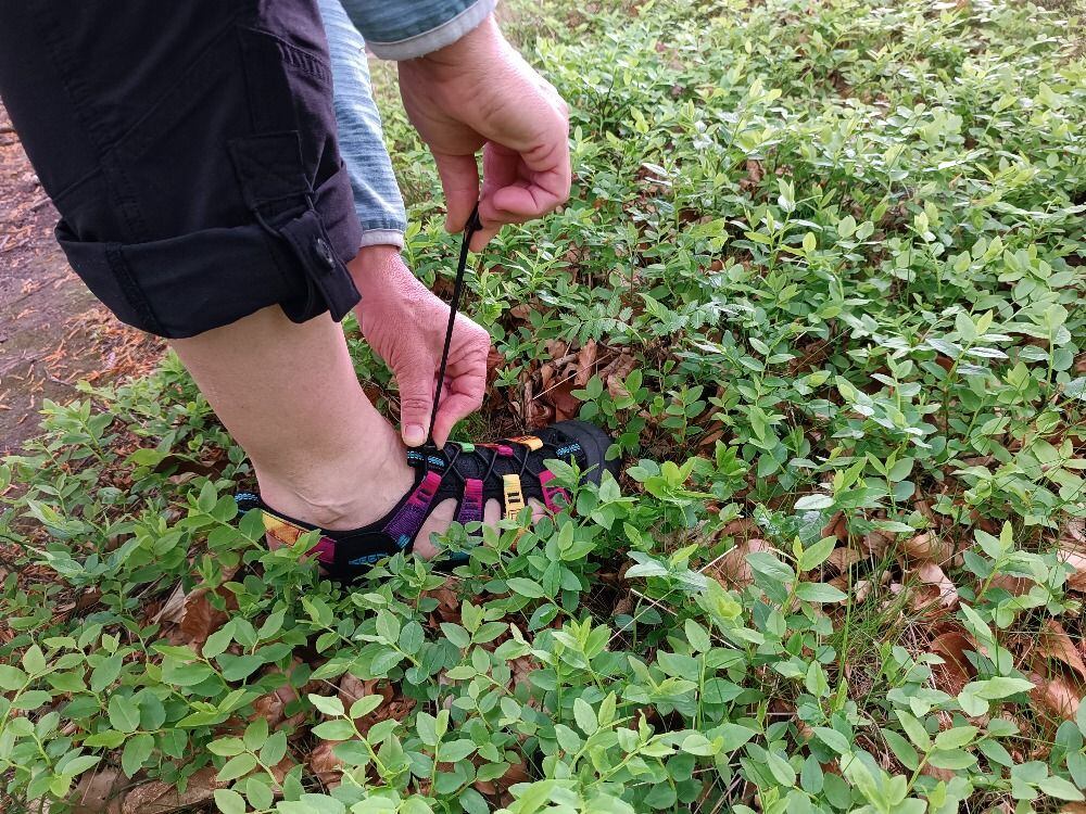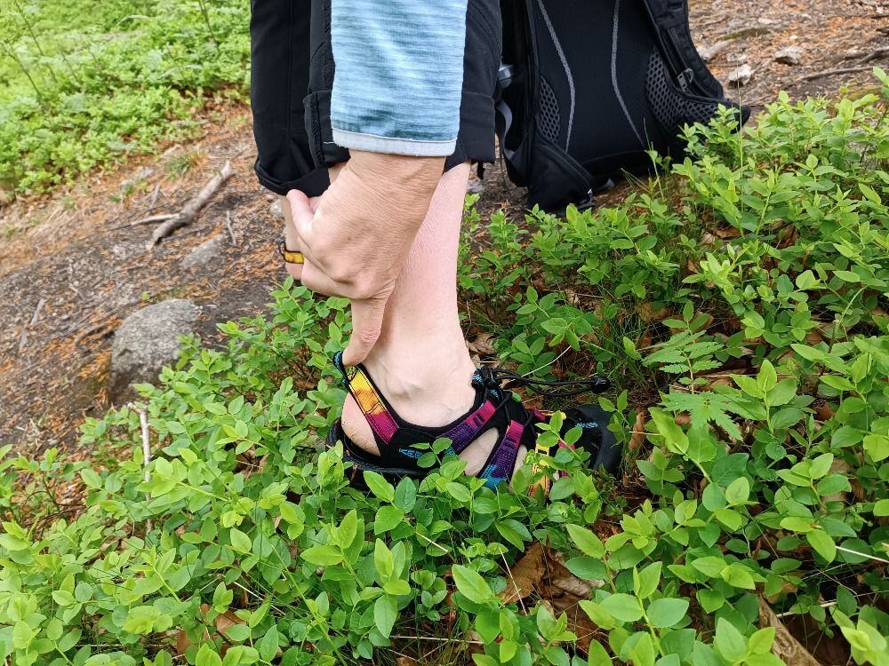 Bota je opatřena EVA mezipodešví a anatomickou EVA stélkou pro pohodlný došlap, což jsem ocenila především při sestupech. Bota je tímto velmi dobře odpružena. Kvalitní gumová podešev s vícesměrným vzorkem a stabilizační klenek zvyšující tuhost boty mi umožnily bezpečný pohyb v terénu. Díky jemným lamelám v materiálu podešve jsem se cítila jistě i na vlhkém povrchu. Boty jsem testovala na lesních cestách, na kamenech, kolem potoků a bota vždy perfektně držela, sandály opravdu nikde neklouzaly.