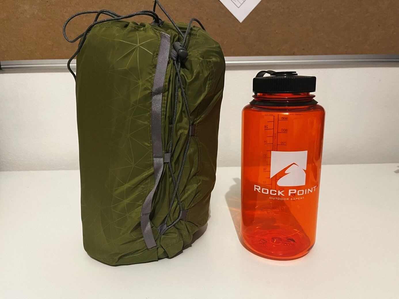 Ukázka velikosti po sbalení v porovnání s litrovou láhví Nalgene