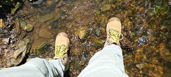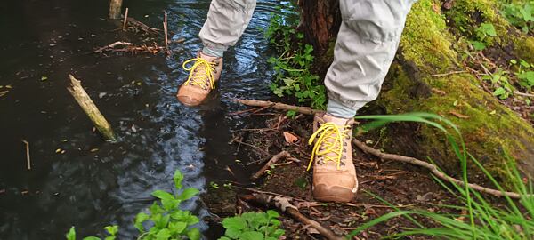 Následně jsem brodila 10 minut potokem, abych zjistila, jestli membrána je nejenom prodyšná, ale i nepromokavá. Opět nohy zůstaly v suchu. Po delší době už začala nasákávat nubuková kůže, ale skrz membránu se nedostala.